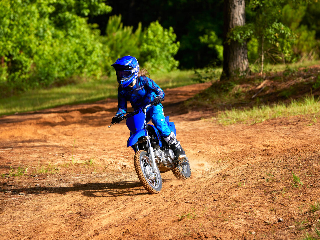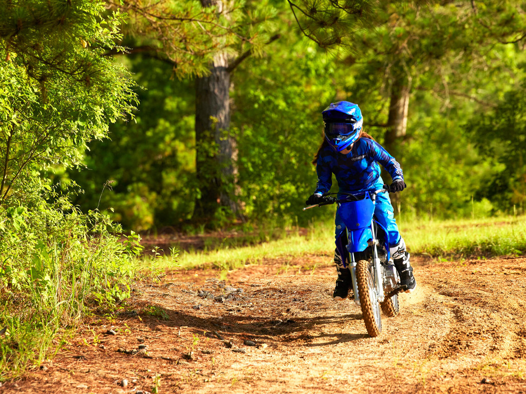 For easy steering and high levels of rider comfort this great-looking motorcycle features a low seat height with long-travel front forks and monocross rear suspension – while the 14-inch front wheel and 12-inch rear wheel are fitted with durable knobbly tyres to handle off road terrain. And the tough Icon Blue bodywork is inspired by Yamaha’s winning race bikes.